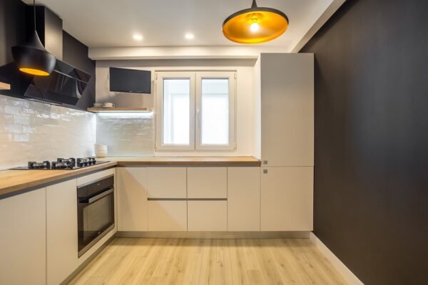 El joven matrimonio quería una decoración alegre, acogedora, de estilo nórdico y que transmitiera la alegría y la ilusión familiar al inicio del viaje. La disposición comenzó con la cocina, situada justo en la entrada del apartamento. El destinatario quería una cocina blanca sencilla con detalles en madera y color. Se propusieron muebles minimalistas, de líneas limpias, sin cuerpos suspendidos que abarrotaran el espacio.