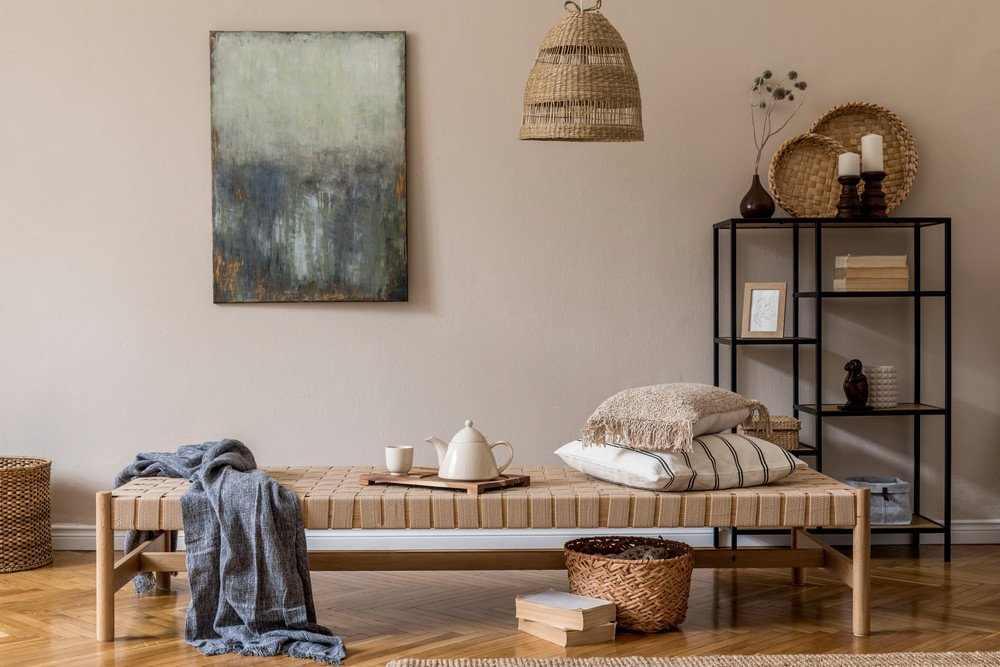 La decoración de una casa de estilo tradicional árabe puede parecer inusual debido a la frecuente falta de armarios. Se utilizan ampliamente muebles tapizados de varios tipos. Cómodos pufs y sofás de varios tamaños y formas, taburetes y sillones son elementos imprescindibles en el estilo árabe. Estos suelen estar cubiertos con caras brillantes de satén o felpa brillantes. El término «sofá» proviene de la palabra árabe «suffah», que significa banco o plataforma, es decir, sofá. Los muebles de madera suelen estar decorados con diseños geométricos y abstractos intrincadamente tallados. Se cortaron partes del mobiliario y los espacios así formados se rellenaron con incrustaciones de madera de diferentes tipos, como nogal, rosa, limón o melocotón. El mobiliario, en colores oscuros, de líneas clásicas y esculturales, contrasta con las paredes claras, y los taburetes de cuero o mosaico, con adornos plateados, completan una ambientación de cuento de hadas. Estas uniones, prácticamente inalteradas a lo largo de los siglos, se denominan arabescos, es decir, una simbiosis de formas geométricas y florales, inscritas en formas severas, todas parecidas a un laberinto. Además de sillas y sofás, los muebles árabes generalmente incluyen mesas de centro poligonales, mamparas, puertas talladas y cómodas.